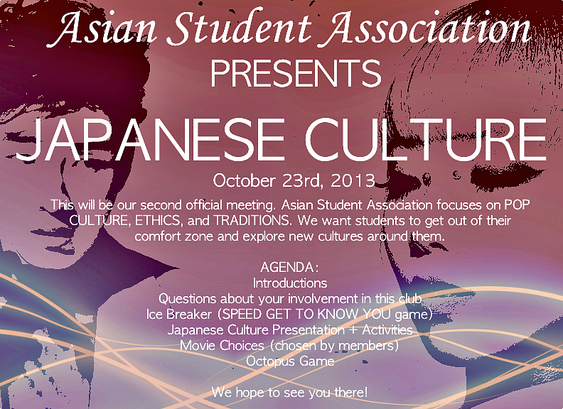 The Asian Student Association presents Japanese Culture. Details can be found on the flyer. Be there from 3-4:30 p.m. in room 9102.