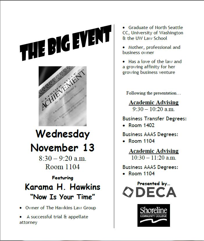 Please spread the news to students! On Wednesday, Nov. 13 from 8:30-9:20 in room 1104, listen to Karam H. Hawkins talk about now being your time. Hawkins is the owner of The Hawkins Law Group, a graduate of North Seattle CC, University of Washington and the UW Law School and a parent, finding a balance between professional life with being a mother.