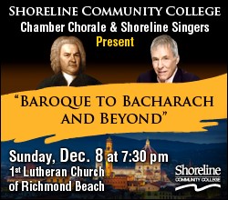 Celebrate the end of the quarter and nourish your spirit in preparation for finals weeks with a concert of exciting and beautiful choral music by the SCC Chamber Chorale and Shoreline Singers this coming Sunday, December 8, 7:30 pm. “Baroque to Bacharach and Beyond” includes classics from the 15th century (“Before Baroque”) to the present by Dufay, Brunetti, Farmer and Fauré, poetry by Shakespeare and Robert Burns, Hebrew and Haitian folk music, a lovely vocal jazz arrangement of a Burt Bacharach classic, and more.