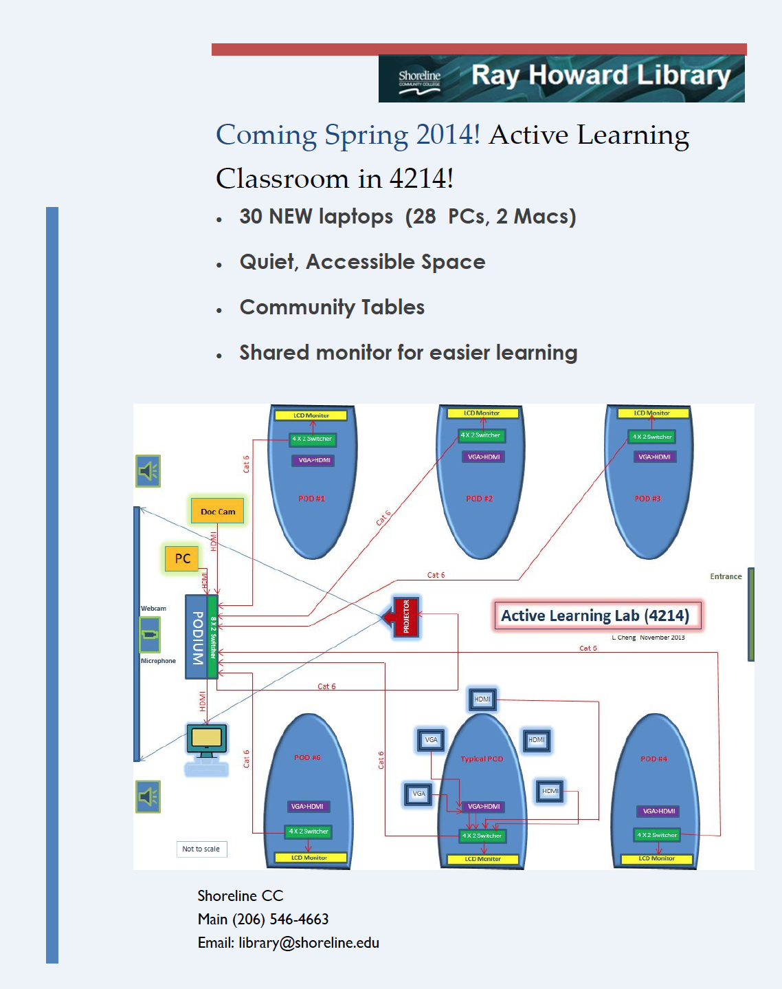 The Library Classroom 4214 is being remodeled! The Office of the VPASA funded us to invent an Active Learning Classroom. Attached is a drawing of the new configuration. Included will be six D-shaped tables with laptops and large screens for projecting work. The Instructor will still have a central large screen on which to demonstrate, but students will be able to send their searches to the big screen as well. We believe this new configuration will encourage collaboration and indepth exploration. The remodel is scheduled to begin Monday, March 17, in order to provide two weeks to get all the work done. The classroom will be unavailable until Monday, March 31. We apologize for the inconvenience, but we think you’ll be happy with the results!