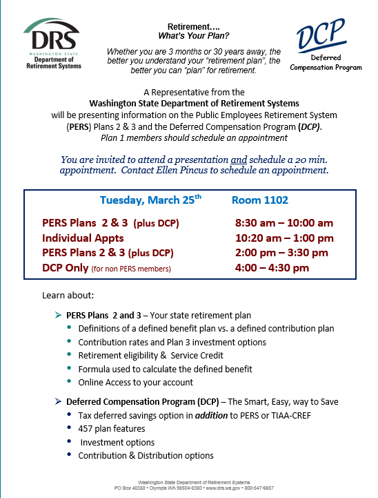 A drop by session is offered in the morning and again in the afternoon for PERS plan members. Also, there’s a 4 pm presentation for non-PERS members interested in the Deferred Compensation Plan. See the attached flyer for details.