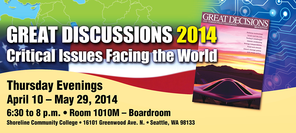 The Global Affairs Center is hosting Great Discussions 2014 this quarter. The group will meet on Thursday nights in room 1010 and the cost is $35, which includes all necessary materials. Below is a list of the topics.