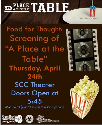 Join Shoreline CC Center for Service-Learning and North Urban Human Services Alliance (NUHSA) next Thursday, April 24, at 5:45 p.m. for a special screening of “A Place at the Table.”