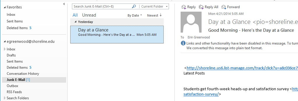 Yesterday we notified users that postini had been disabled. As a result, today users might have seen some messages filtered into Junk E-mail. Below is a real-life example: Today I found that the Day At A Glance email message went to the Junk E-mail folder.