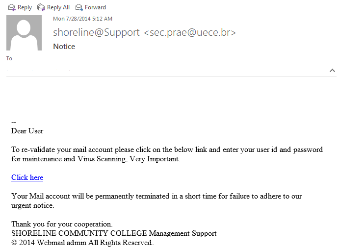 Spam messages will even try to include Shoreline Community College in the message. Don’t be fooled!