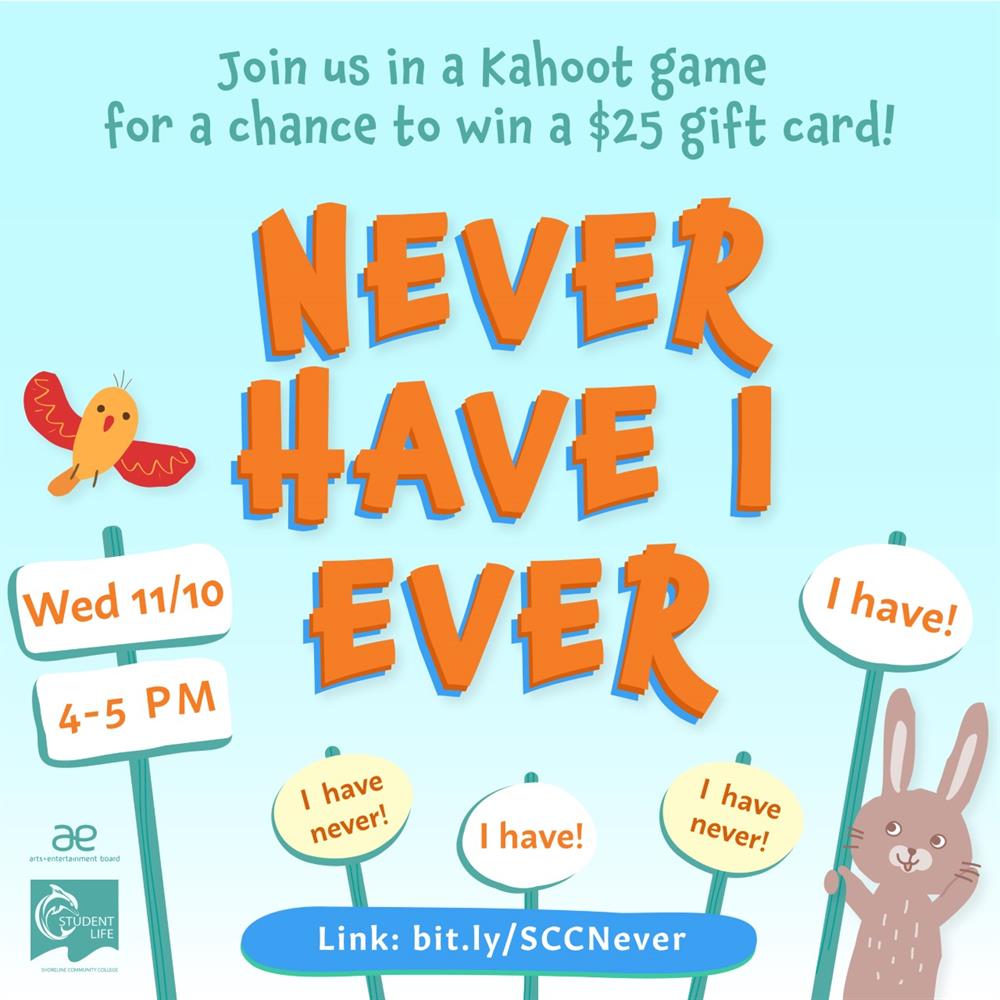 Encourage students to attend this event! Join Student Life for a fun Kahoot game of “Never Have I Ever” and for a chance to win a $25 Amazon gift card! https://bit.ly/SCCNever