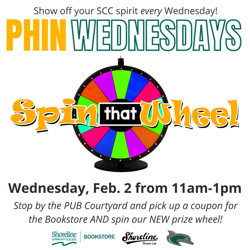 PHIN WEDNESDAYS ARE BACK! Stop by the PUB Courtyard on Wednesday, Feb. 2 from 11am-1pm and get a Bookstore coupon to use on your next purchase! Students can spin the prize wheel for a chance to win some SCC swag!