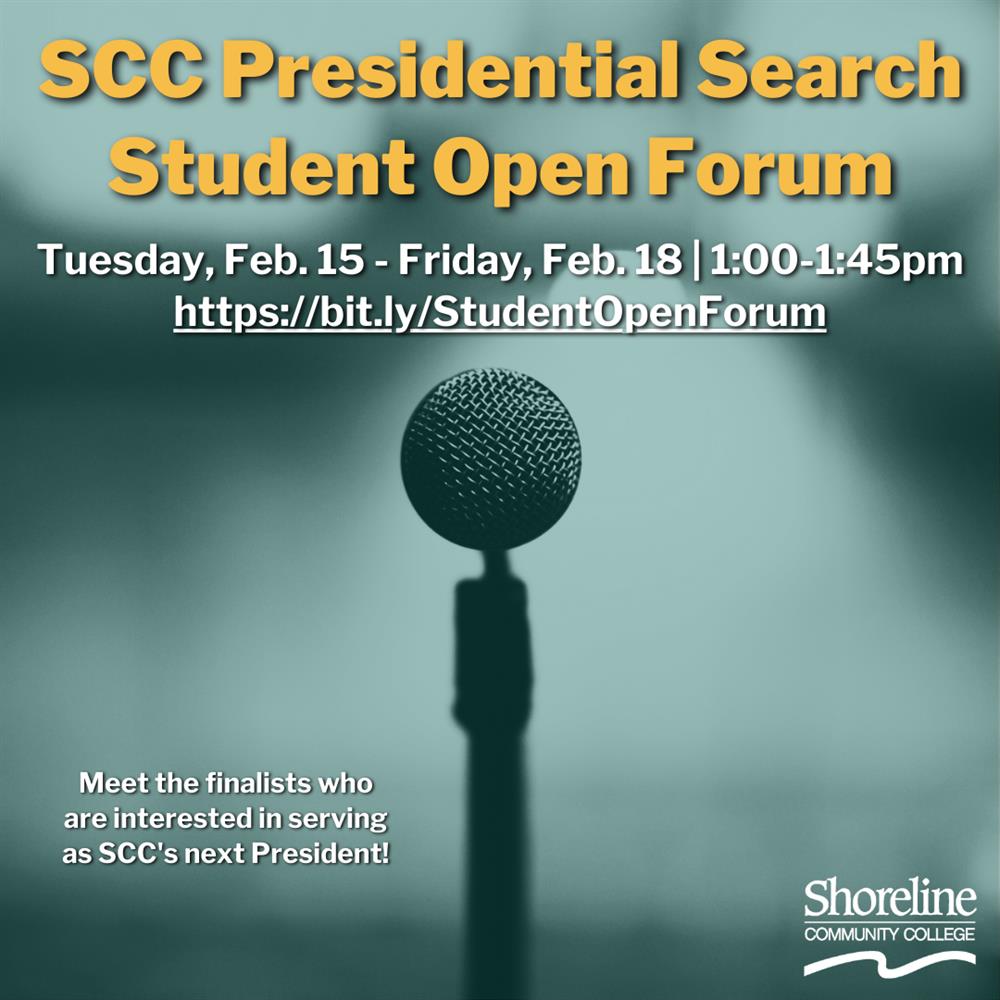 Please share with students! All current students are invited to meet the finalists who are interested in serving as SCC’s next President! Student Open Forums will be held with each candidate from Tuesday, Feb. 15 thru Friday, Feb. 18 from 1:00-1:45pm. To participate, go to https://bit.ly/StudentOpenForum.