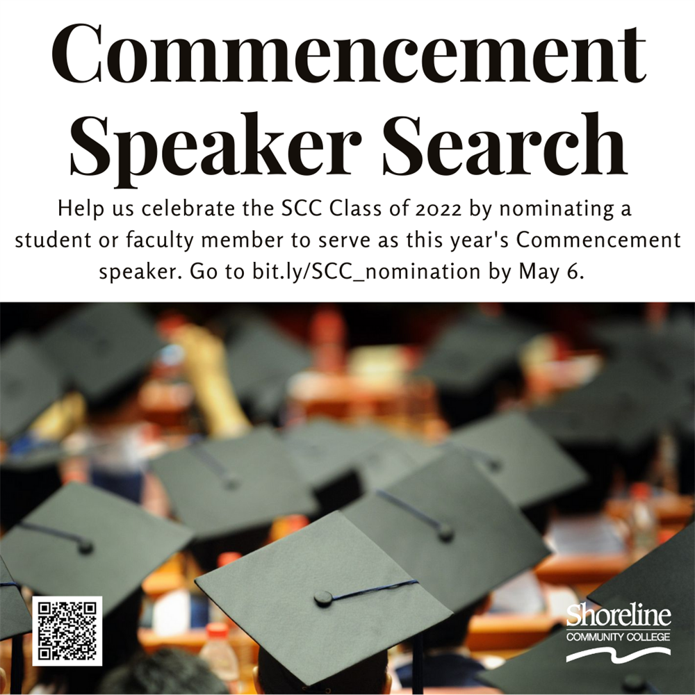 All students, faculty, and staff are invited to submit nominations for student and faculty Commencement speakers, and for recipients of the Student Service Award. Help honor the accomplishments of the Class of 2022 by recognizing students and faculty who have made significant contributions to our community or whose journey and experiences reflect the spirit of Shoreline. To nominate someone, go to https://bit.ly/SCC_nomination and complete the brief form by Friday, May 6, 2022.