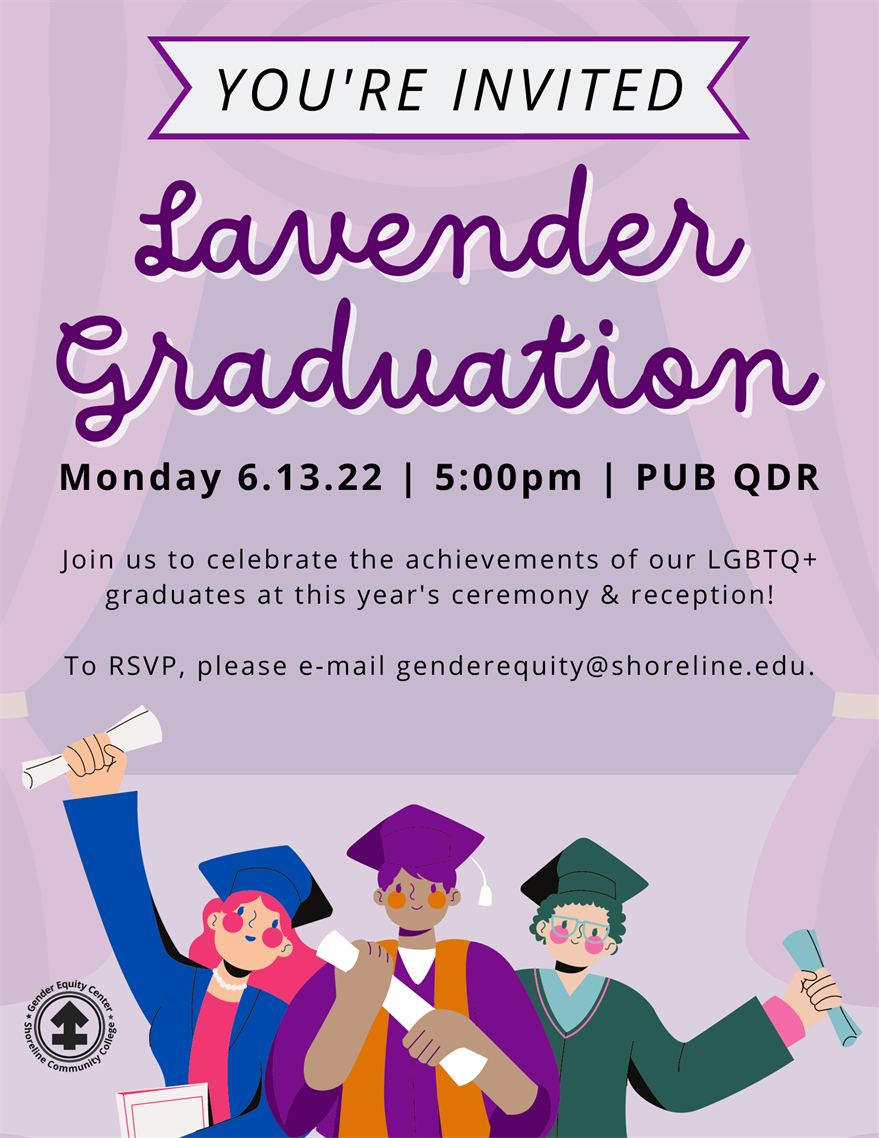 The Gender Equity Center is proud to present the 2022 Lavender Graduation ceremony, which will be held on Monday, June 13 from 5:00-6:30pm in the PUB QDR (9208). This event will celebrate the accomplishments of our LGBTQ+ graduates, so please encourage any students that you know to sign up to participate: https://bit.ly/scclavgrad22.