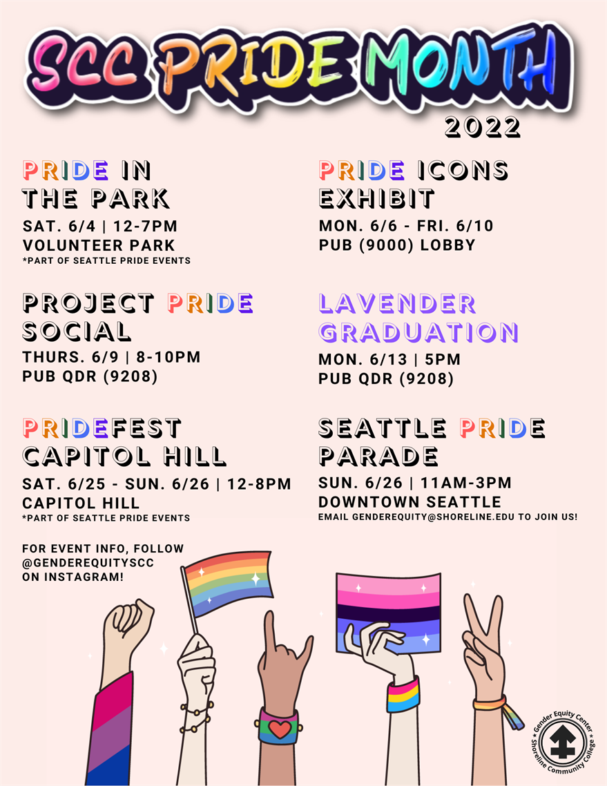 June is Pride Month! Join the Gender Equity Center and Project Pride for a variety of events throughout the month, including Project Pride’s social, Lavender Graduation, and several Seattle Pride events including the return of their annual Pride Parade! For more information e-mail genderequity@shoreline.edu.