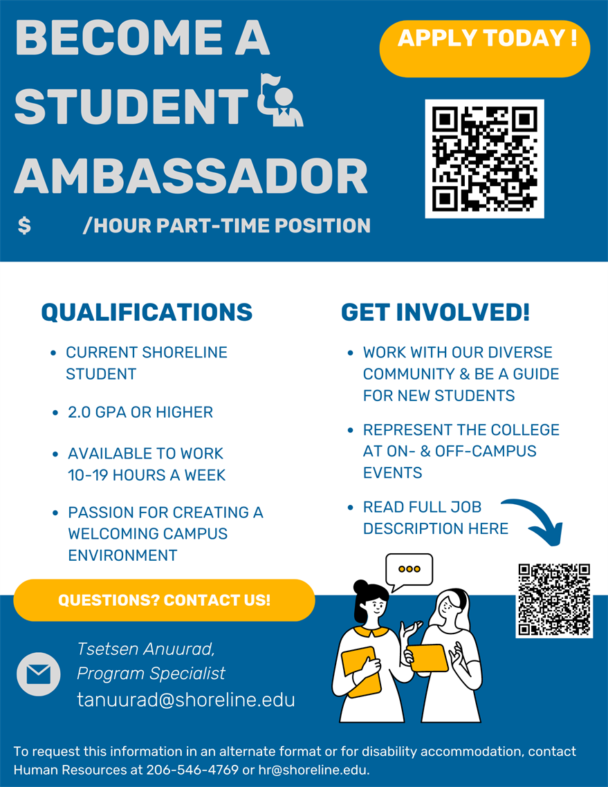 We are hiring current Shoreline students to become peer mentors for other students on campus! Students can apply to be an eLearning Peer Mentor or a First Year Mentor. If you know students who are passionate about getting involved on campus and/or students who would be a great fit to be a peer mentor, please encourage them to apply using the online application form here. You can also refer students directly to the contact list provided below.