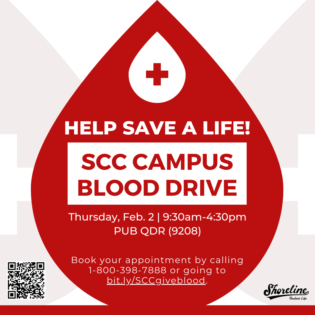 Shoreline Community College & Bloodworks Northwest are hosting a campus blood drive on Thursday, Feb. 2 from 9:30am-4:30pm in the PUB Quiet Dining Room (9208). SCC students, faculty, and staff are encouraged to make an appointment to donate by going to bit.ly/SCCgiveblood.