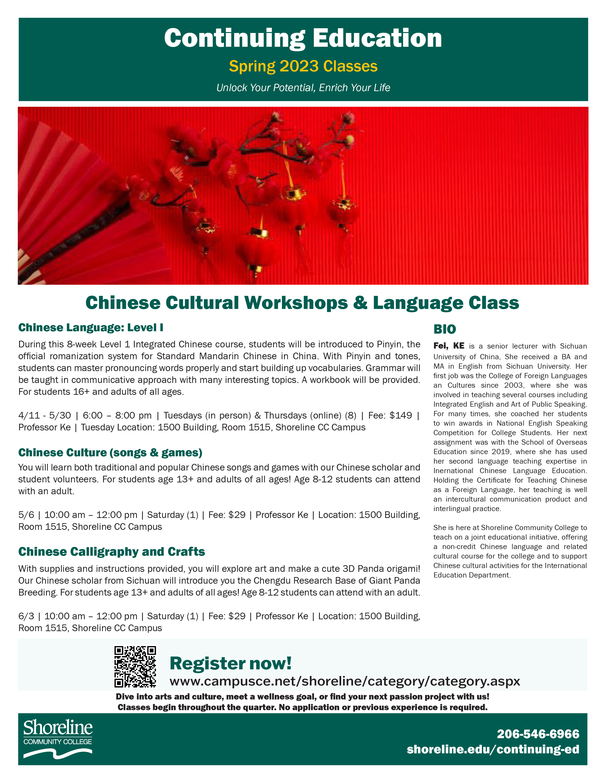 She is scheduled to teach the Chinese Language Level 1 class and two workshops.