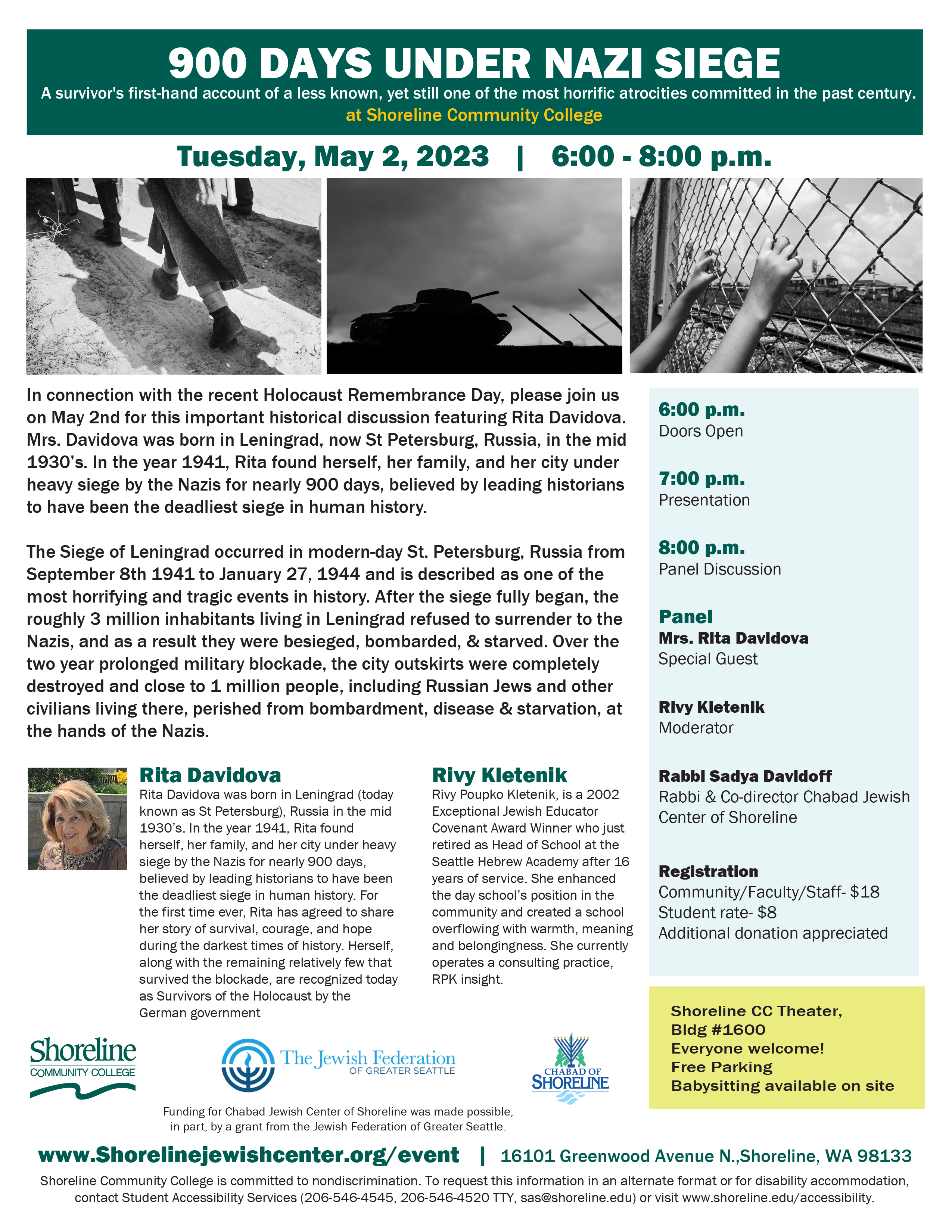 We have the unique opportunity to have a Holocaust survivor travel to us from out of state and share their story at the Shoreline Community College on Tuesday (tomorrow) May 2, 6 p.m. in the campus theater.