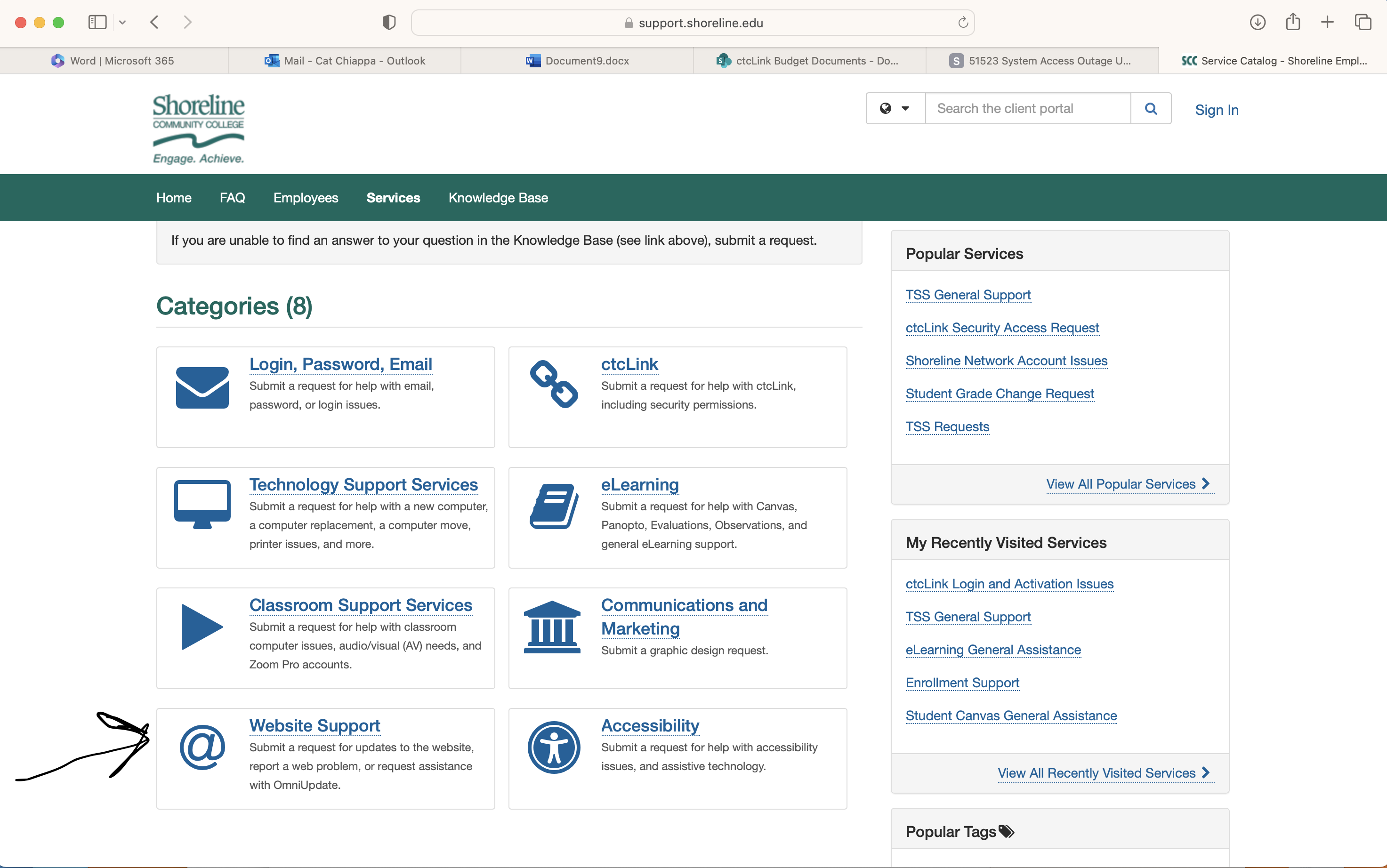 If you have a request to add or need to update something on the www.shoreline.edu site, you may submit a request using the new link that TSS created for us on the Support site. Thanks, TSS! I have included an image below (nobody is allowed to laugh at my subpar screenshot drawing skills 😉) and you can get to the link here.