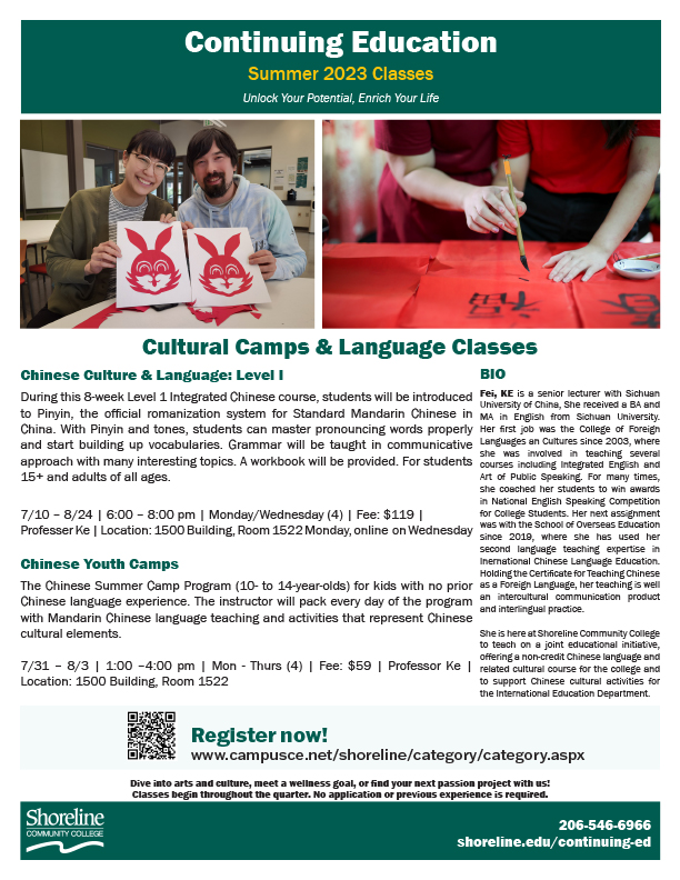 Come join the Continuing Education team for these two wonderful offerings in July/August- Chinese Culture & Language Level I and Chinese Youth Camps!