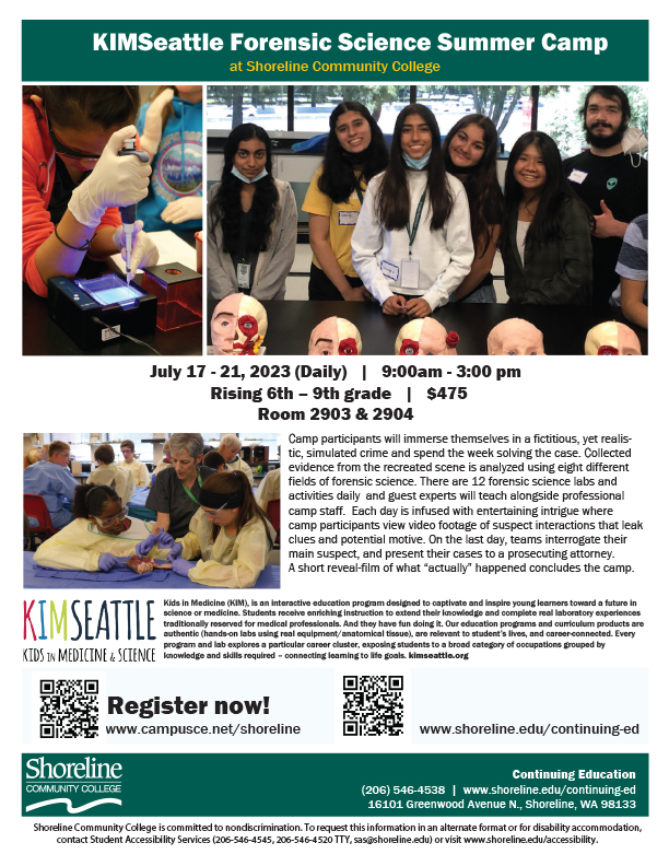 Email for more information: info@kimseattle.org and KIMSeattle Forensic Science Summer Camp (campusce.net)