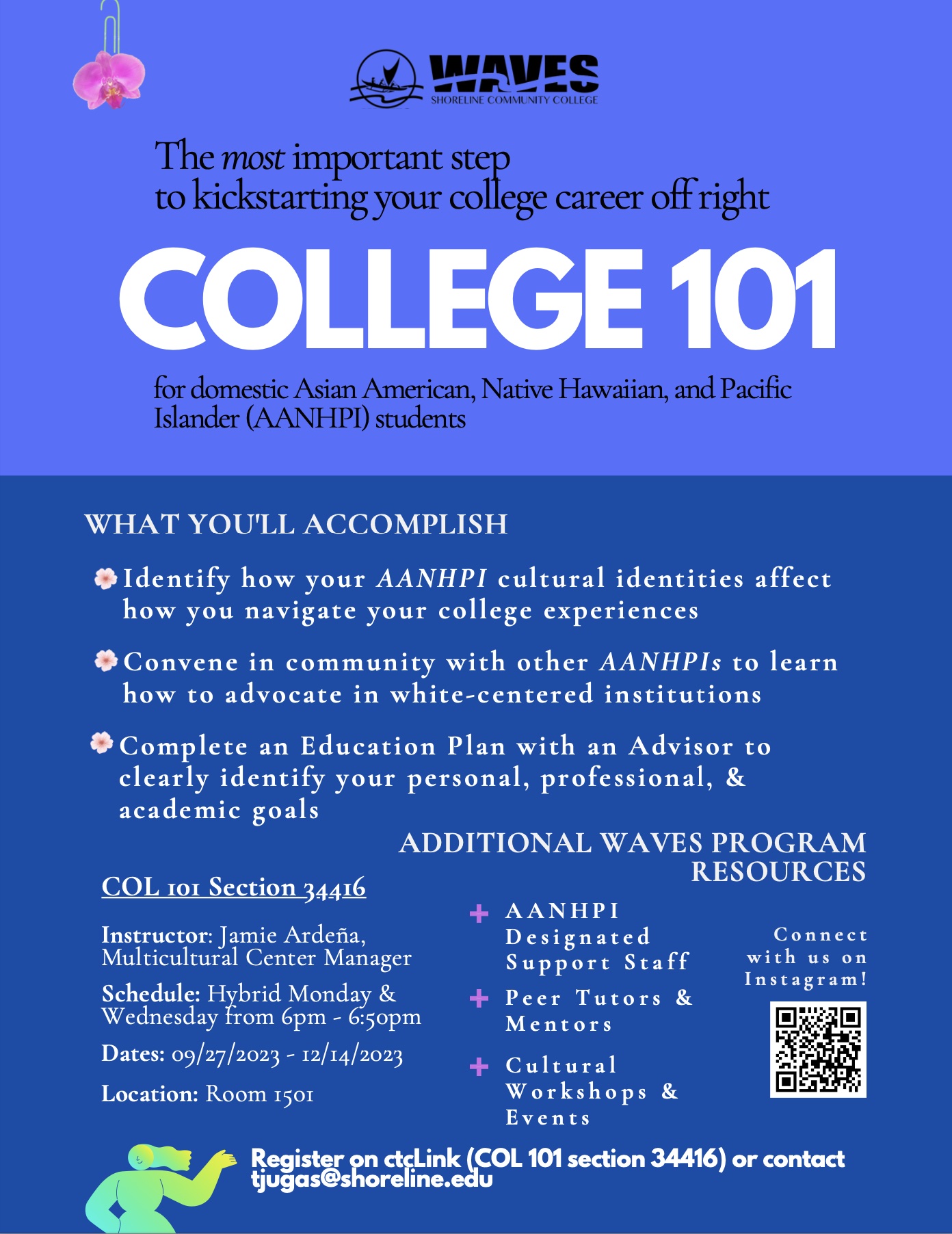 Please encourage any domestic AANHPI students who are undecided in their major, need support navigating through Shoreline, who can benefit from a course like this and prosper with the guidance of WAVES wrap-around support services, to register for COL 101 AANHPI course.