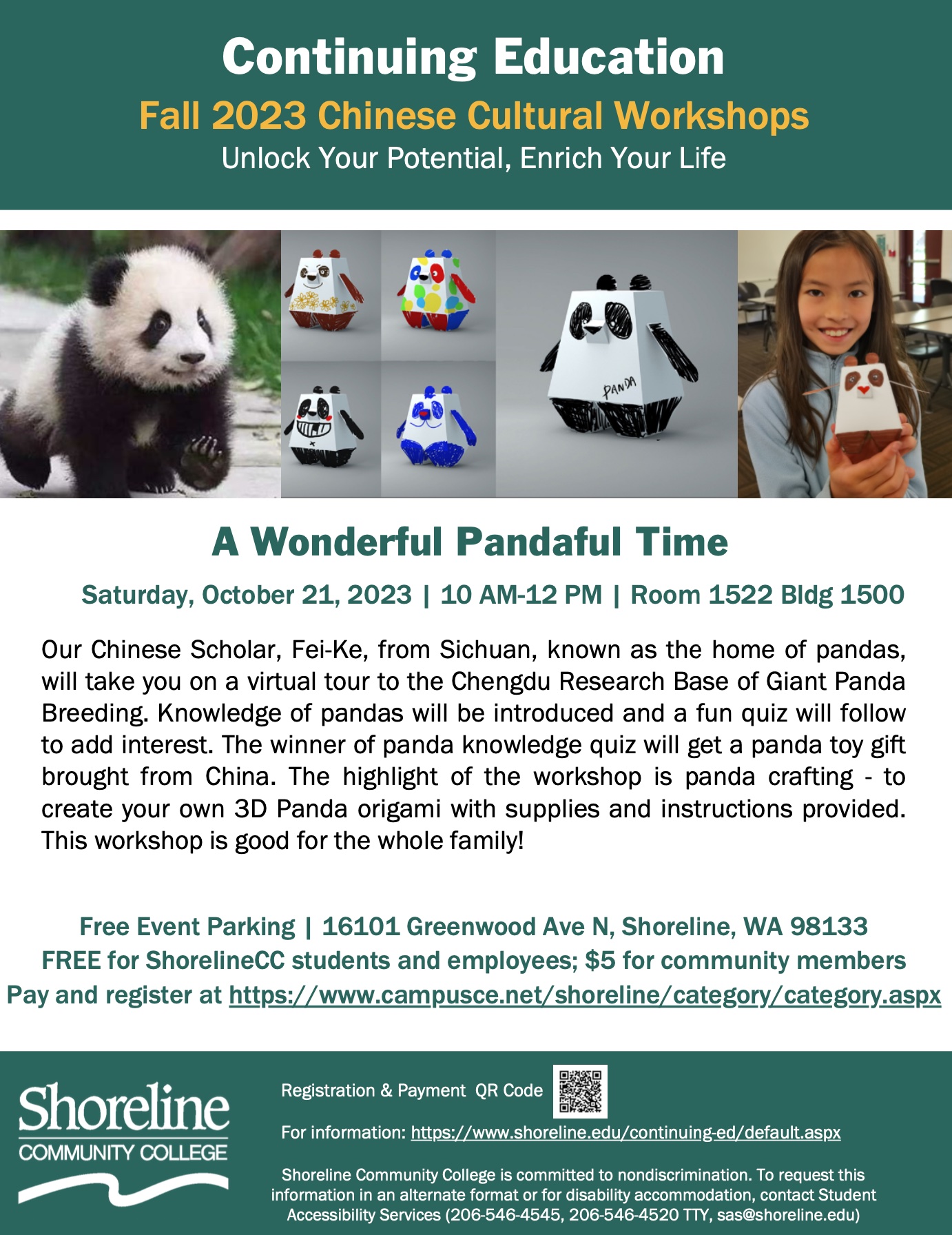 Our Chinese Scholar, Fei Ke, from Sichuan, known as the home of pandas, will take you on a virtual tour to the Chengdu Research Base of Giant Panda Breeding. Knowledge of pandas will be introduced and a fun quiz will follow to add interest. The winner of panda knowledge quiz will get a panda toy gift brought from China. The highlight of the workshop is panda crafting – to create your own 3D Panda origami with supplies and instructions provided. This workshop is good for students aged 13+ and adults of all ages! Age 8-12 students can attend with an adult.