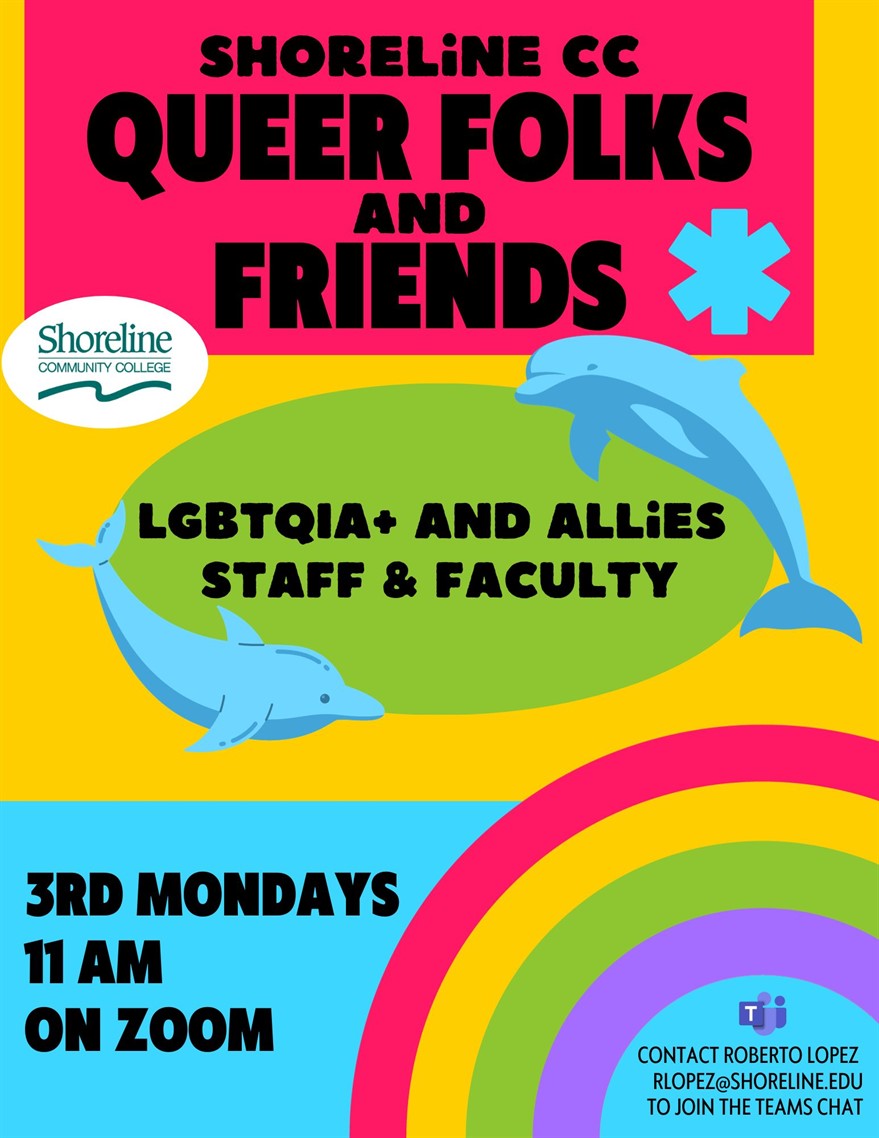 Queer Folks and Friends is a monthly affinity group that provides a brave space for Queer folx and allies of Shoreline Community College to build and foster community. We aim to create an environment where folx feel empowered to show up as their truest and most authentic selves and further serve the institution’s mission, values, and goals of inclusive excellence.
