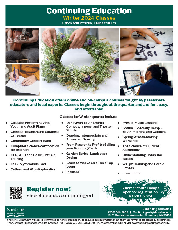 Continuing Education has so many non credit, affordable classes scheduled for Winter quarter! Check out the catalog online and register today!