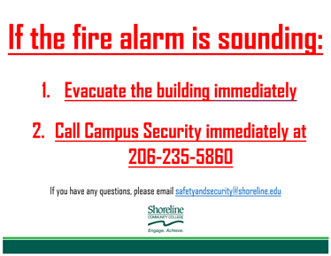 Safety mechanisms that remain in place in these building include active horns and strobes (audible and visual alerts) which willnotify occupants in the building if there is any need to evacuate. Should an evacuation be necessary, occupants should contactCampus Security directly once they have left the building to provide notification that the alarms have been triggered (call the On-Duty Officer Cell Phone 206-235-5860). Campus Security will then coordinate a response from the Shoreline Fire Department if required.