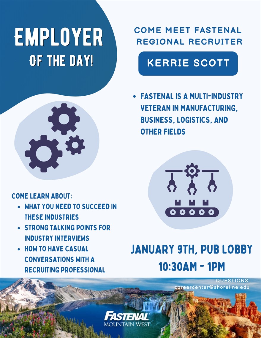 Do you have an employer you’d like to have on campus? Let us know! We’ll plan to host these events twice a month for the rest of the school year leading up to a bigger Career Fair. Feedback and questions can be emailed to: careercenter@shoreline.edu