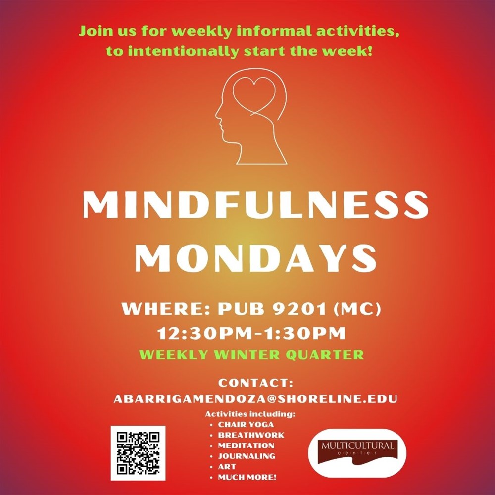 Join us for Mindfulness Mondays this winter quarter for various informal activities, such as chair yoga, meditation, and journaling. We are student-led through the Multicultural Center, holding space for BIPOC students, but open to all students and staff!