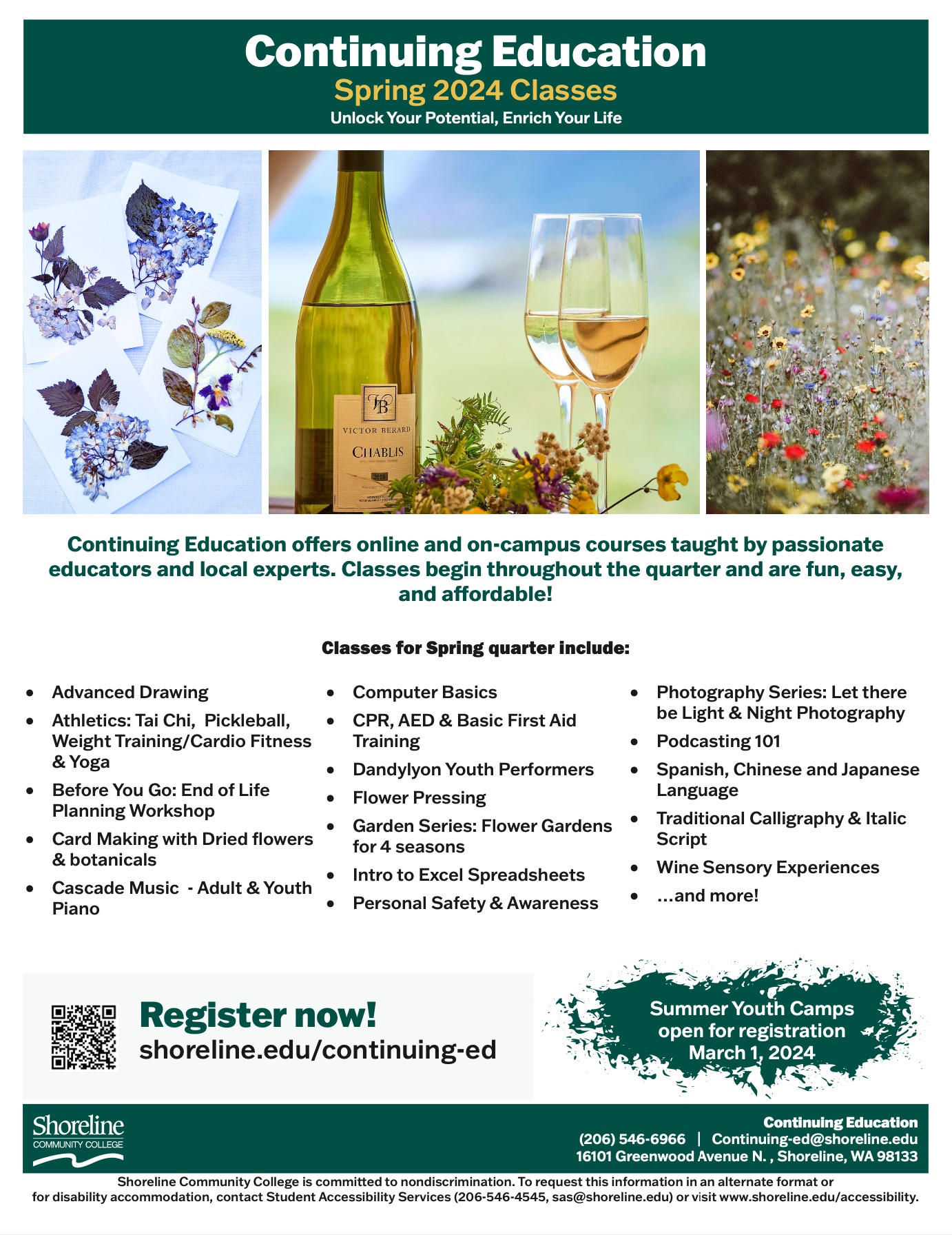 Check the registration link for details and to register: Shoreline Community College (campusce.net)