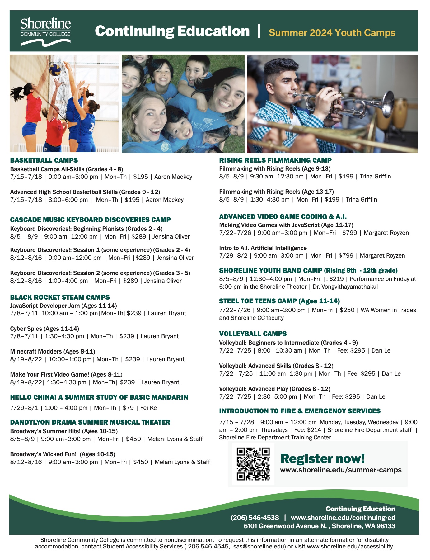 New youth camps added for Summer 2024! Our new Volleyball coach for Shoreline CC is hosting 3 camps this summer for kids and teens! Also, the College Workforce and CECO departments are partnering with the Shoreline Fire Department to hold an Introduction to Fire & Emergency Services course for 2 weeks in July. For more information and to register, check out the Continuing Education flyer and our catalog linked here! Youth Programs (campusce.net)
