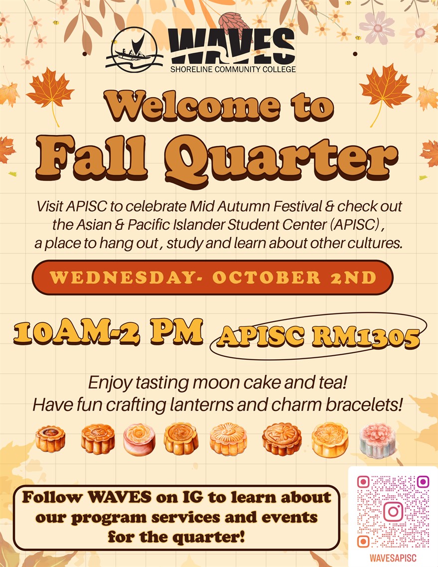 The WAVES program invites you to welcome in Fall Quarter and to celebrate Mid-Autumn Festival with us at our Asian & Pacific Islander Student Center (APISC), room 1305.