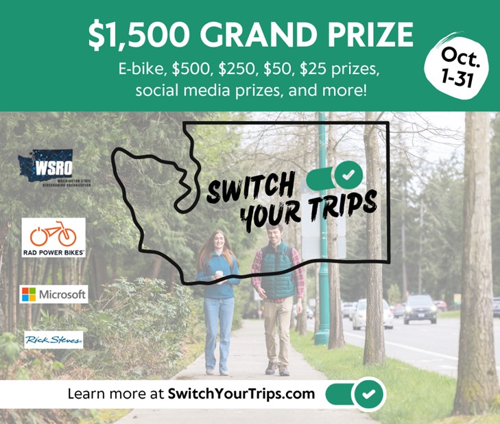 Complete and log at least ten trips during October and you will be automatically entered in a drawing for the chance to win some amazing prizes—modes include carpool, vanpool, bus, train, light rail, foot ferry, bicycle, walking, rolling, skateboarding., or a combination of all modes.