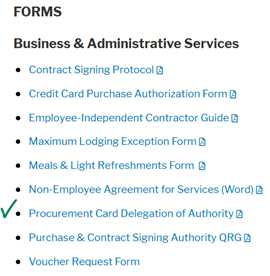 We have updated the “Procurement Card Delegation of Authority” form, and it is available for to retrieve online. Currently the VPBAS will approve requests until we hire a number of vacant positions. The “Forms” repository may be accessed at https://www.shoreline.edu/intranet/forms.aspx.