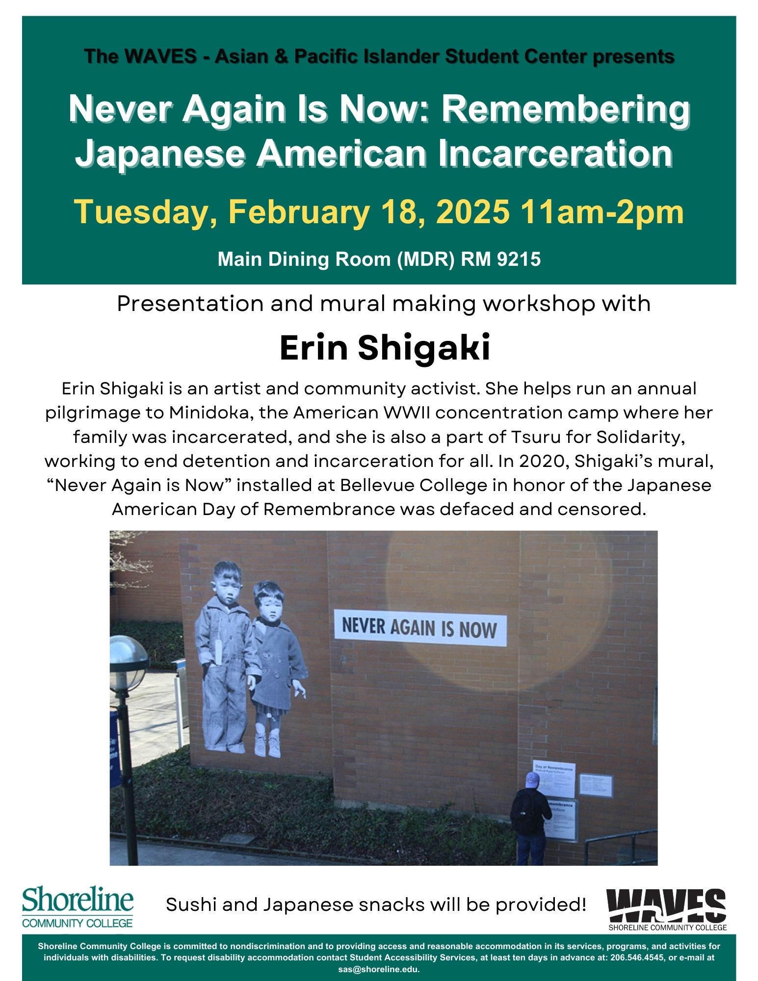Please join us in commemorating the Japanese American Day of Remembrance with local artist and community activist Erin Shigaki. Shigaki will deliver a presentation titled, Never Again Is Now: Remembering Japanese American Incarceration and lead a mural-making workshop. Sushi and Japanese snacks will be provided!