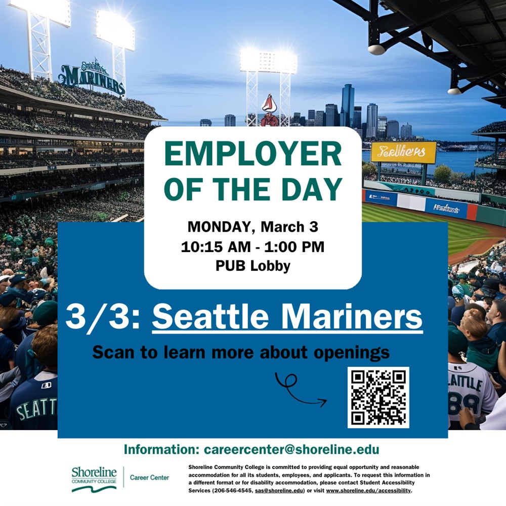 The Career Center is excited to invite our students to an ADDITIONAL Employer of the Day event where they can connect and learn about local employer and major league baseball team: Seattle Mariners ⚾