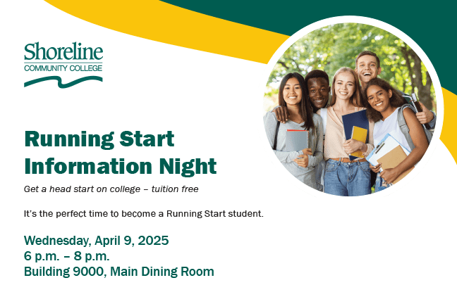 Shoreline Community College will be hosting a Running Start Night for interested high school students on Wednesday, April 9, 2025 from 6:00-8:00pm in the Main Dining Room of the 9000 Building.
