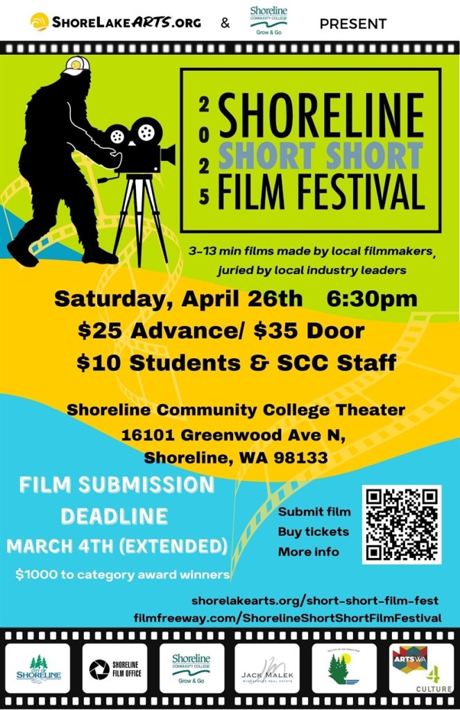 Shoreline Short Short Film Festival, produced by ShoreLake Arts, aims to support emerging and developing filmmakers in Washington State and encourage appreciation for the art of filmmaking in our community.