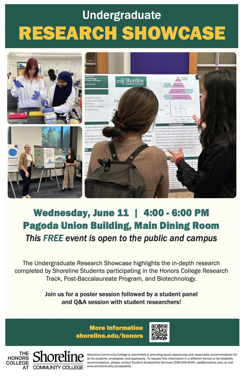 The Undergraduate Research Showcase highlights the in-depth research completed by Shoreline Students participating in the Honors College Research Track, Post-Baccalaureate Program, and Biotechnology.