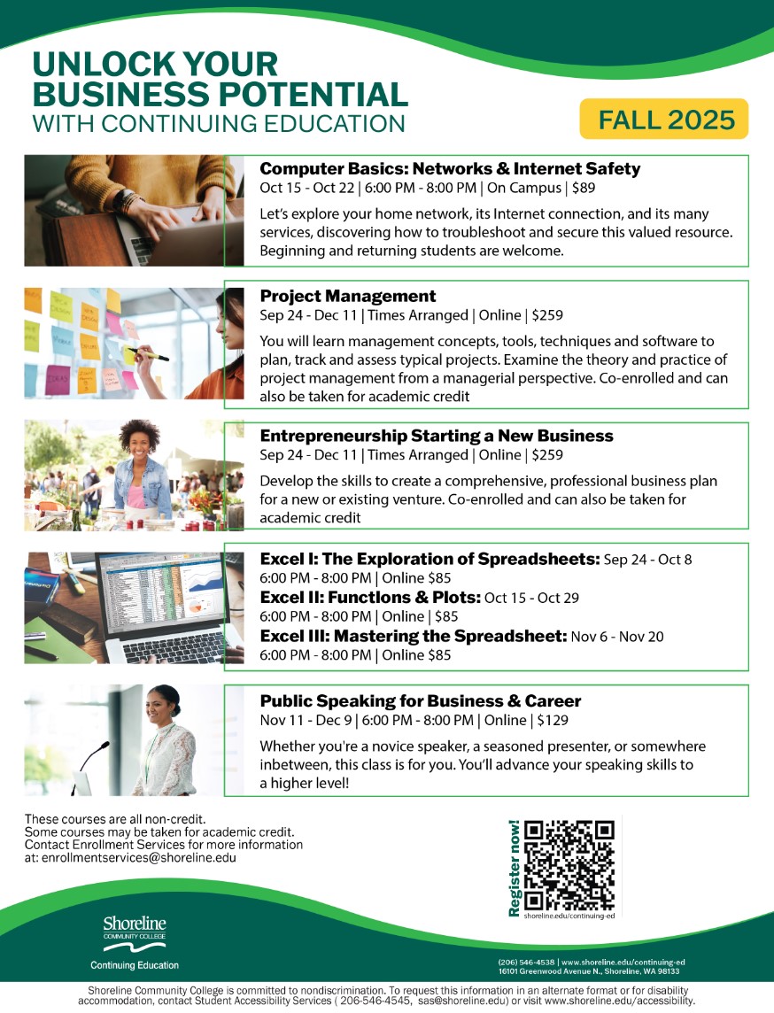 Whether you’re starting a business, growing your career, or building practical skills, our Continuing Education fall classes are designed to help you succeed. From computer basics to project management, Excel to public speaking, there’s something for every professional.