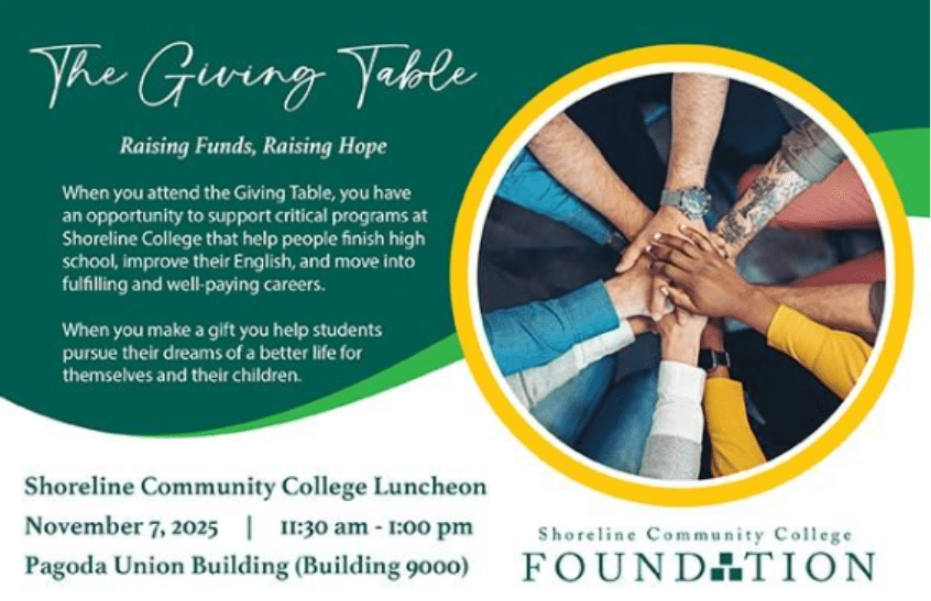 Save the date – November 7 from 11:30 – 1:00 – The Giving Table Luncheon in support of the students and programs of Shoreline College! Want to know more – click here!