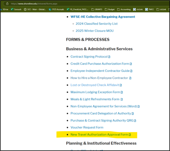 Please use the “New Travel Authorization Approval Form” to document your E-Team Member’s pre-approval and submit along with your other travel authorization paperwork. It is posted on the Employee Forms and Resources Intranet page under Forms & Processes. Screen snip is below.