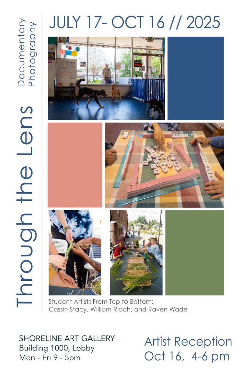Documentary Photography coursework, taught by faculty member Lauren Greathouse at Shoreline Community College, focuses on the culmination of an entire quarter of visual storytelling and service to the community. These Shoreline student artists spent an entire quarter working in collaboration with a non-profit of their choosing within the Seattle area, merging art and agency through the selection of images on display.