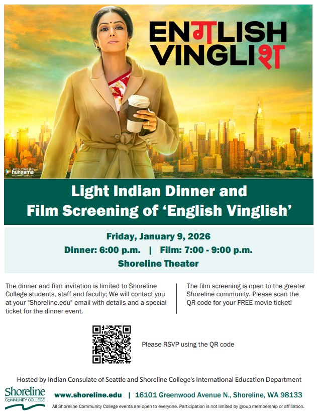 The Indian light dinner and movie are free to Shoreline College students, faculty and staff. Pre-registration is required for the dinner. Click here to register.