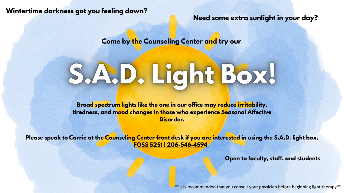 Please speak to Carrie at the Counseling Center front desk if you are interested in using the S.A.D. light box.