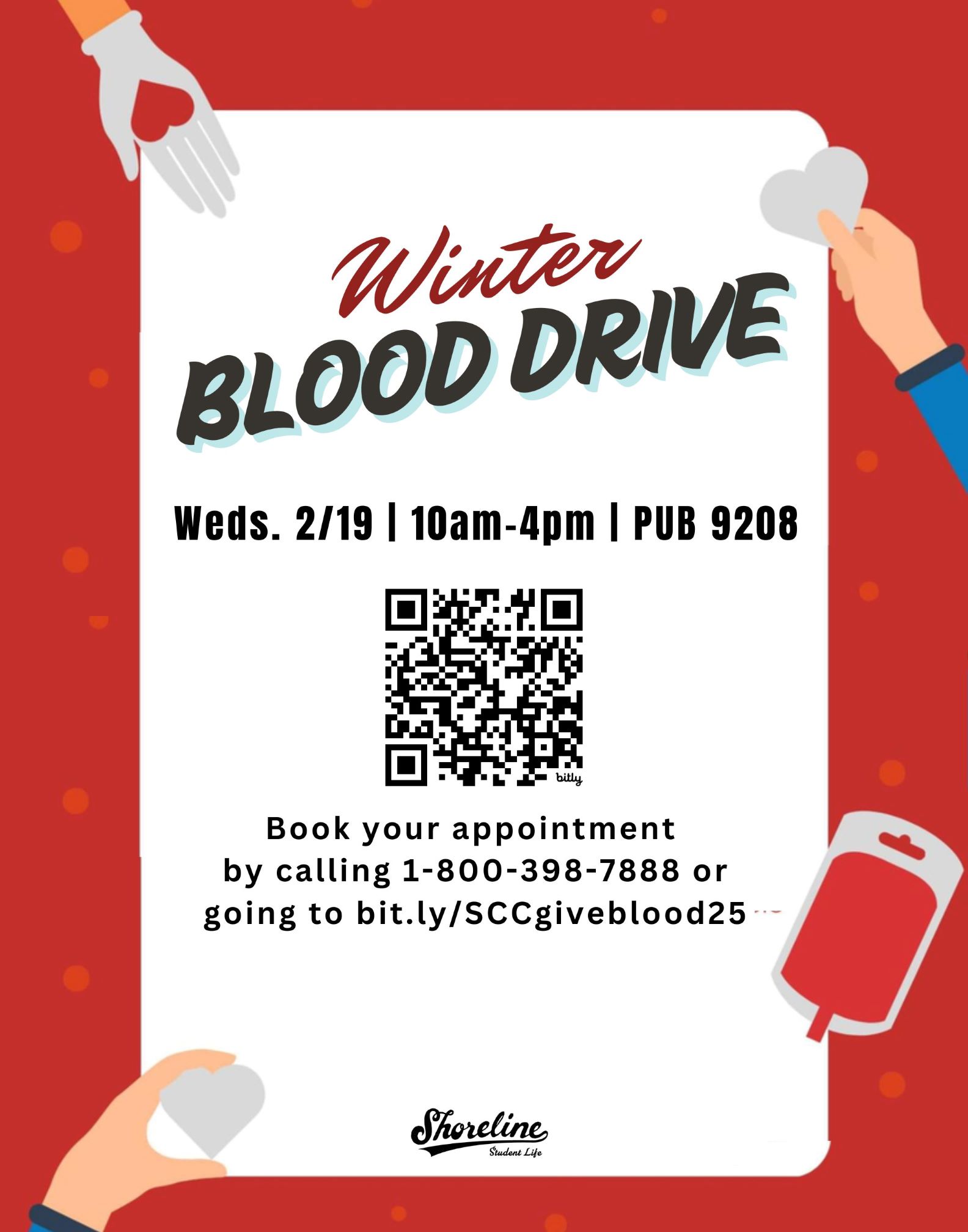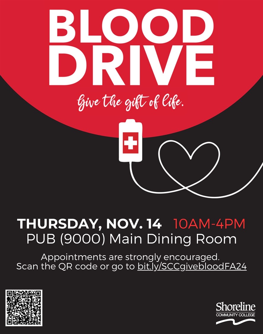 Shoreline Community College & Bloodworks Northwest are hosting a campus blood drive on Monday, Feb. 21 from 10:00am-4:00pm in the PUB QDR (9208).