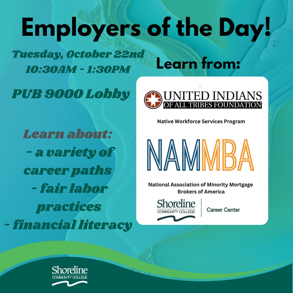 This week you’ll have the chance to learn from two great organizations, United Indians of All Tribes Foundation (Native Workforce program) and NAMMBA (National Association of Minority Mortgage Brokers of America) about a wide variety of career paths, fair labor laws and practices and even some financial literacy tips.