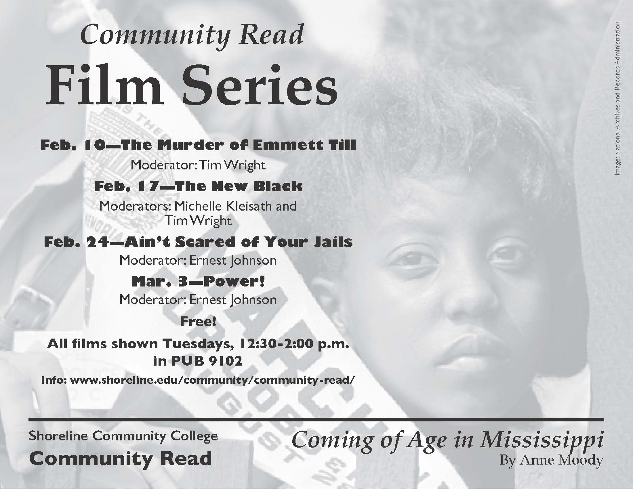 This event is free and open to the general public. Please come and explore connections between the historical events that surrounded Ann Moody’s novel, Coming of Age in Mississippi, and compelling issues we still face today around race, injustice and discrimination both locally and globally. We’ll look at activism, then and now, as Shoreline commemorates the 50th anniversary of the Civil Rights Act and the Voting Rights Bill and celebrates the birthday of Dr. Martin Luther King.