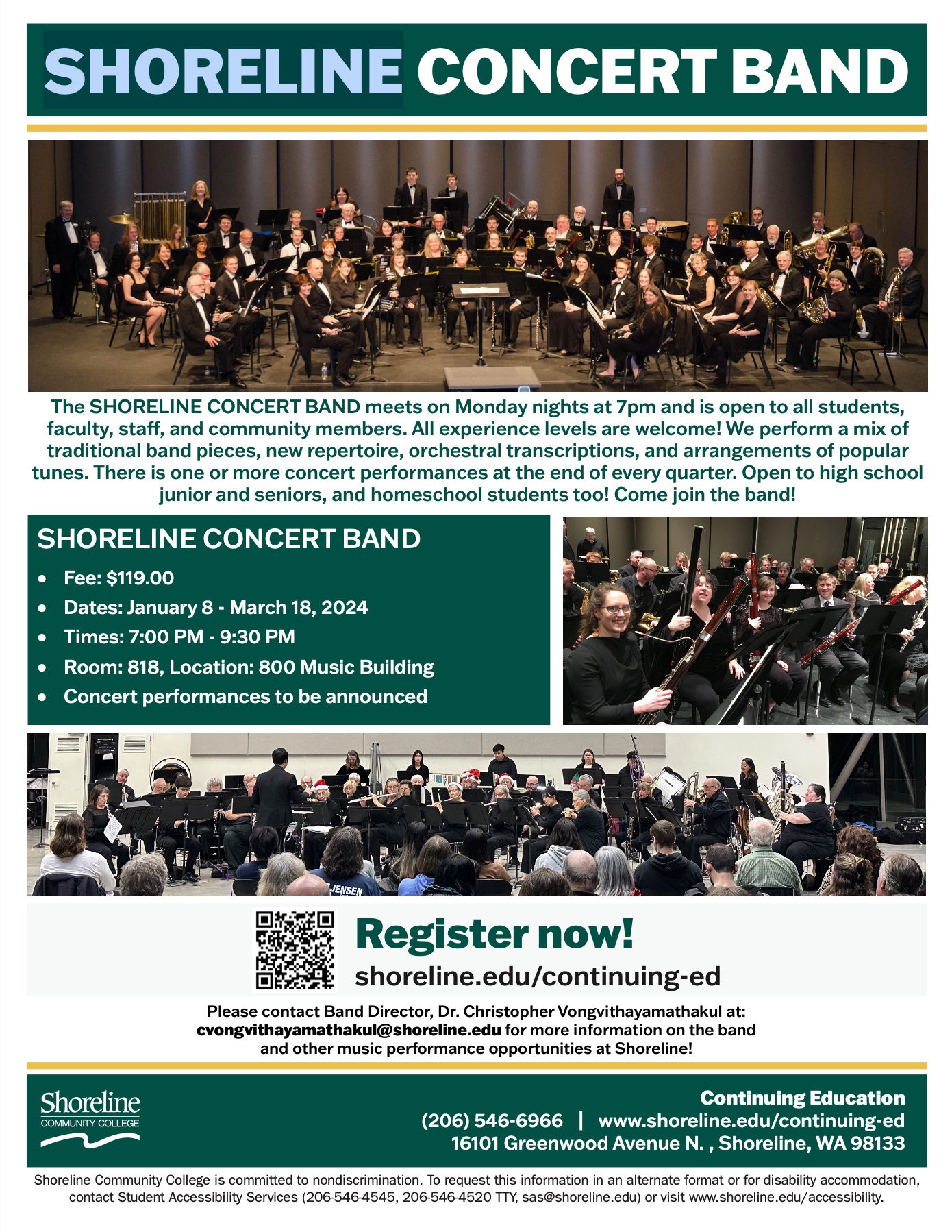 We are offering classes in person on the college campus and online for your convenience. These non-credit classes are for youth and adults of all ages. Classes are scheduled between January 8th and March 16th, 2024. Get more details on the College website: Continuing Education | Shoreline Community College and our registration page: Shoreline Community College (campusce.net).