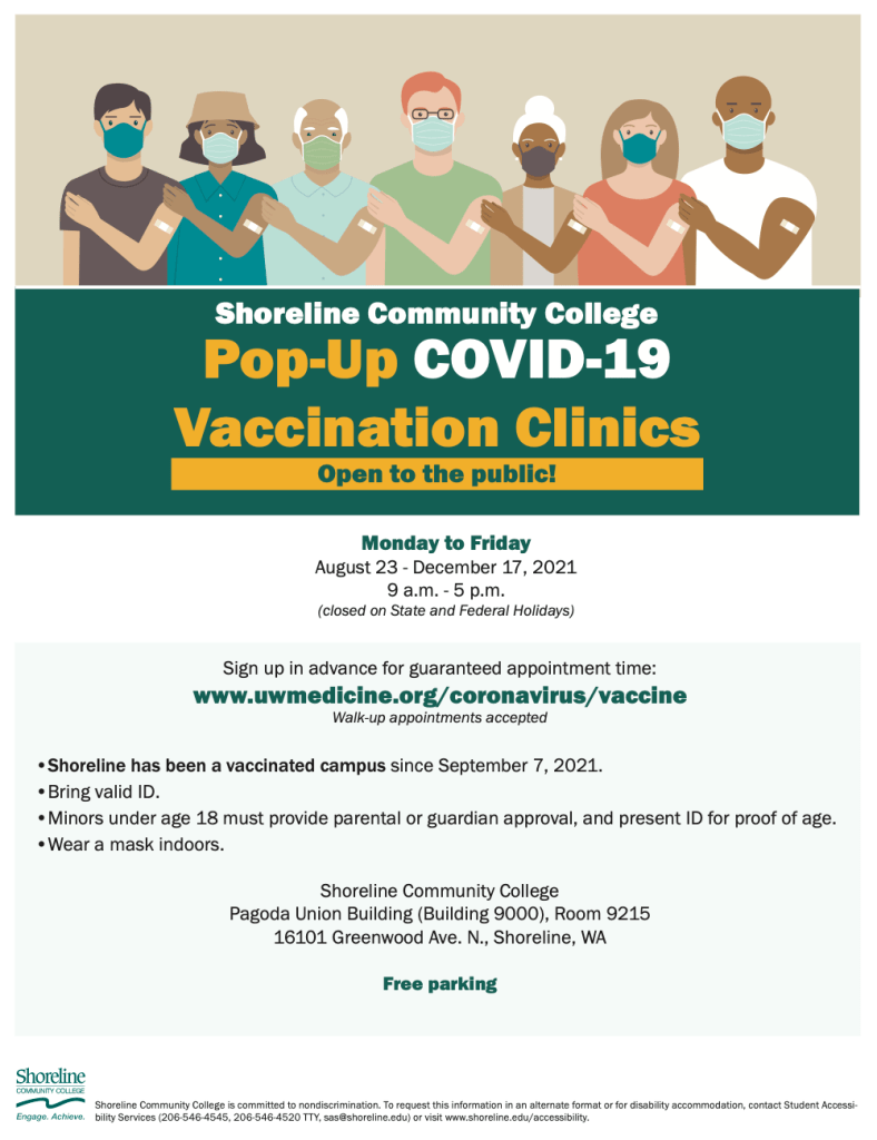 - Flu Vaccine Pop-Up Clinic, Thursday, November 4th from 11:00am – 1:00pm in the PUB (9000 Building), Room 9208 (Quiet Dining Room). Sign up in advance online. Students, family and staff are welcome to attend. Flu shots are free for those with approved insurance, including Apple Health. Masks are required indoors.